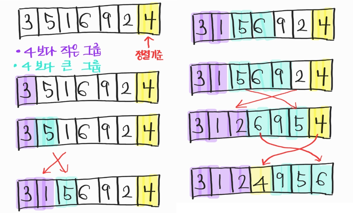 /*하나씩 돌면서 pivot과 비교 > pivot보다 작으면 위치 바꾸기 */